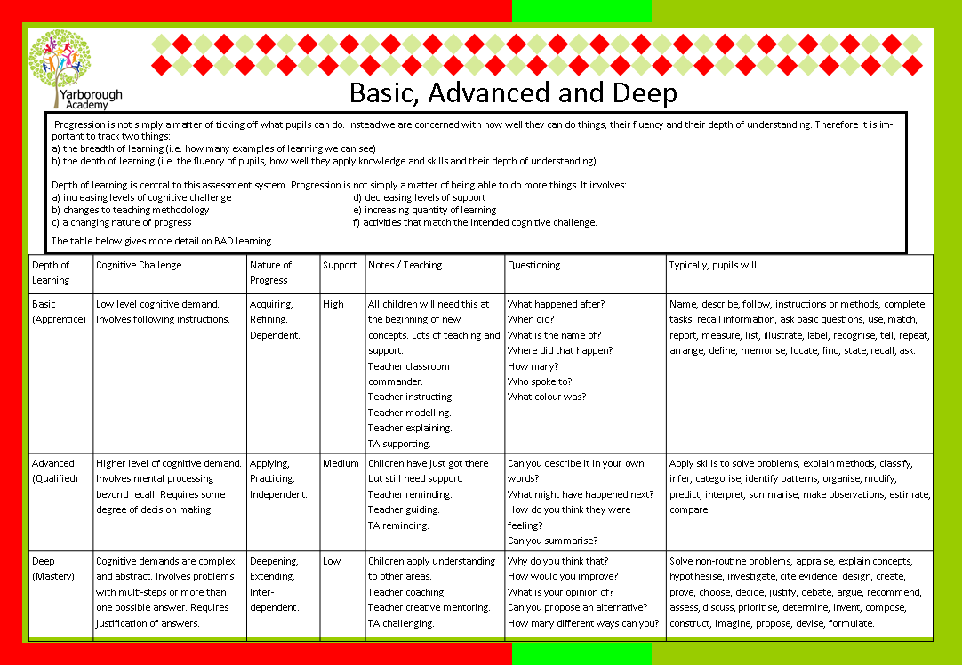 On order to understand Basic, Advancing and Deep (BAD) please click on this link - BAD table